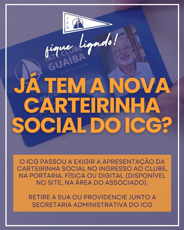 FIQUE LIGADO! O ICG passou a exigir a apresentação da carteirinha social no ingresso ao clube, na portaria. Física ou digital (disponível no site, na Área do Associado) esteja em mãos com a sua ao entrar no clube.Retire a sua ou providencie junto a secretaria administrativa do ICG.