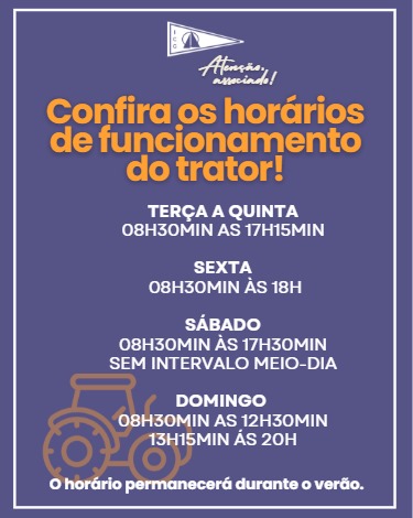 Informamos que os horários de funcionamento do trator para o período de verão. O atendimento ocorre de terça a quinta-feira, das 8h30 às 17h15. Nas sextas-feiras, o horário é ampliado até as 18h, com início às 8h30. Aos sábados, o funcionamento acontece das 8h30 às 17h30, sem intervalo ao meio-dia. Já aos domingos, o atendimento é dividido em dois turnos: das 8h30 às 12h30 e das 13h15 às 20h. Os horários permanecerão válidos durante todo o verão.